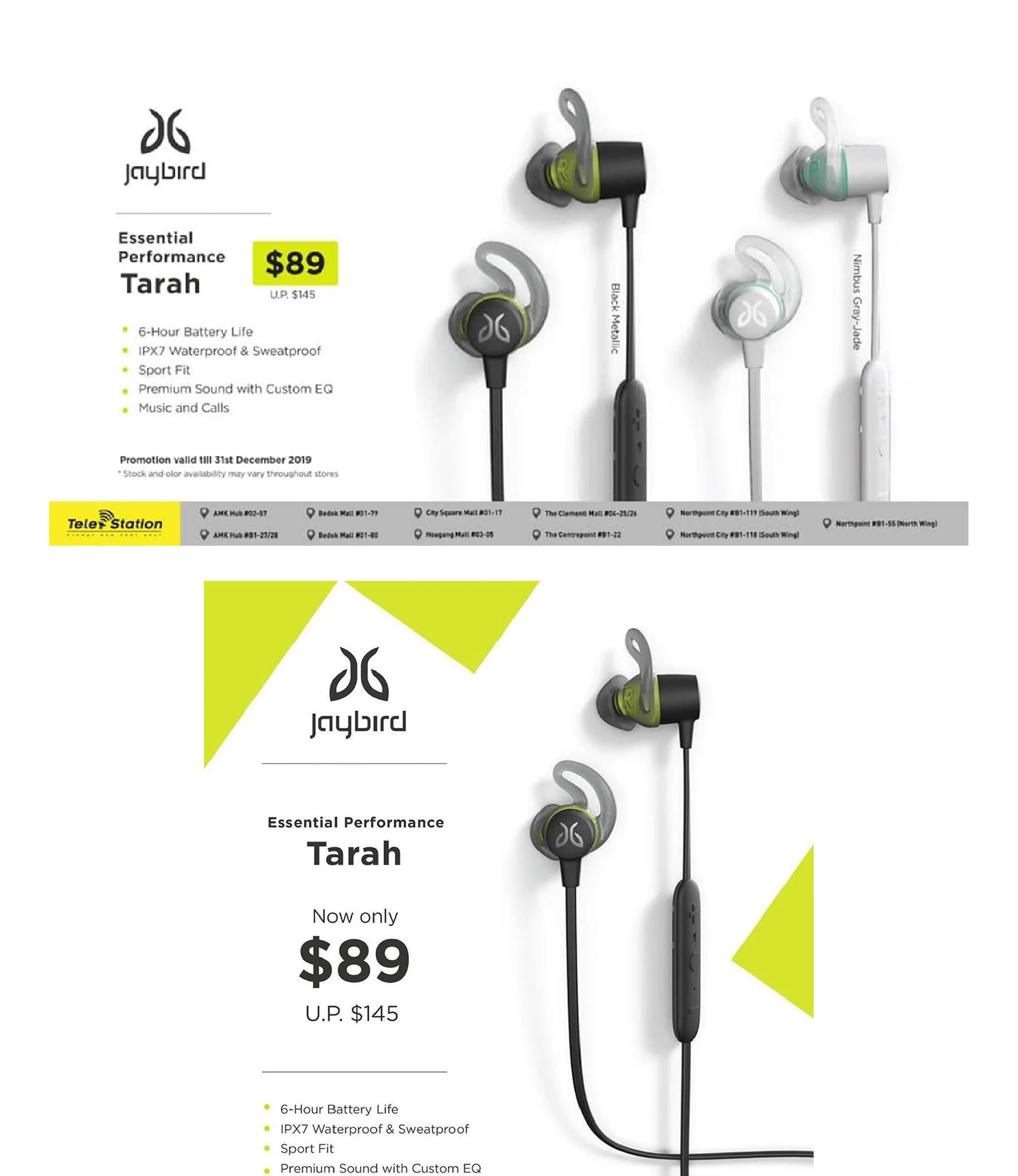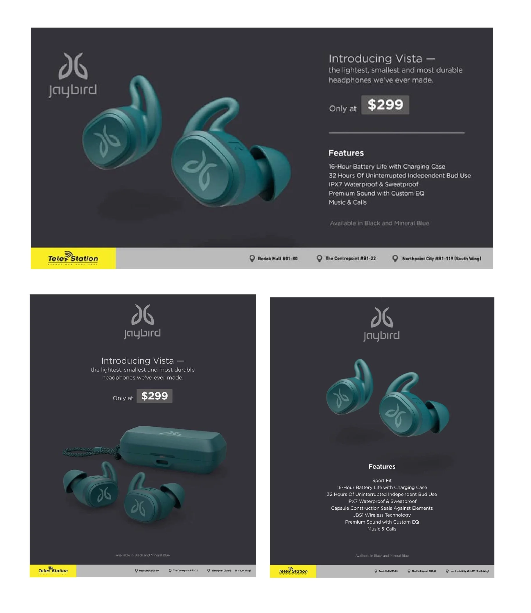 This series of campaign assets features Jaybird earbuds, including the Vista and Tarah models, designed for digital placements and social media. The work focuses on presenting product performance and key features through clean, modern layouts that emphasize clarity and visual impact.