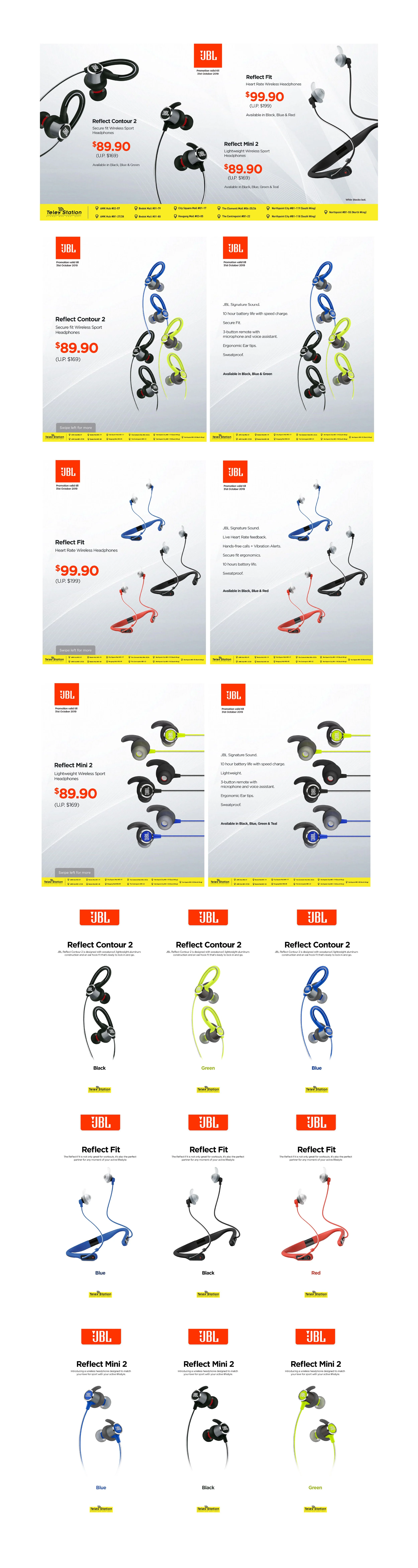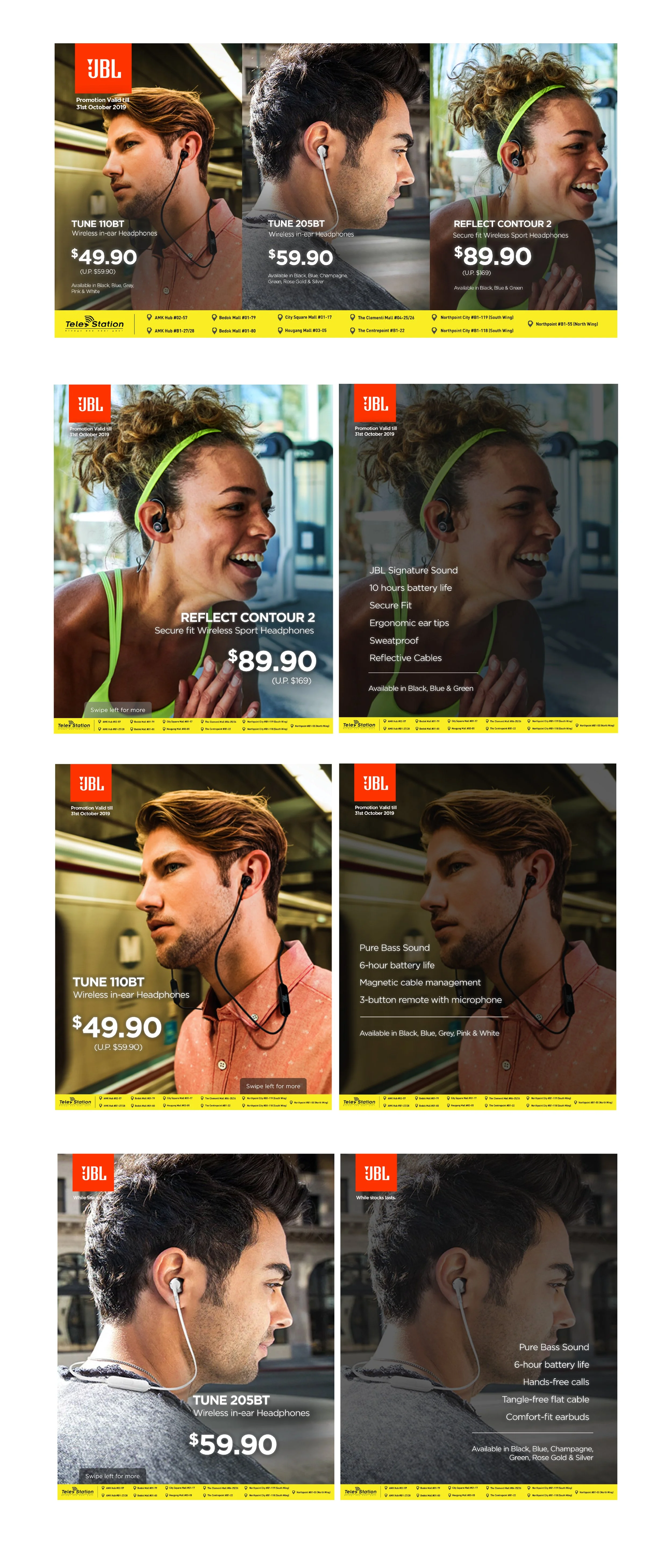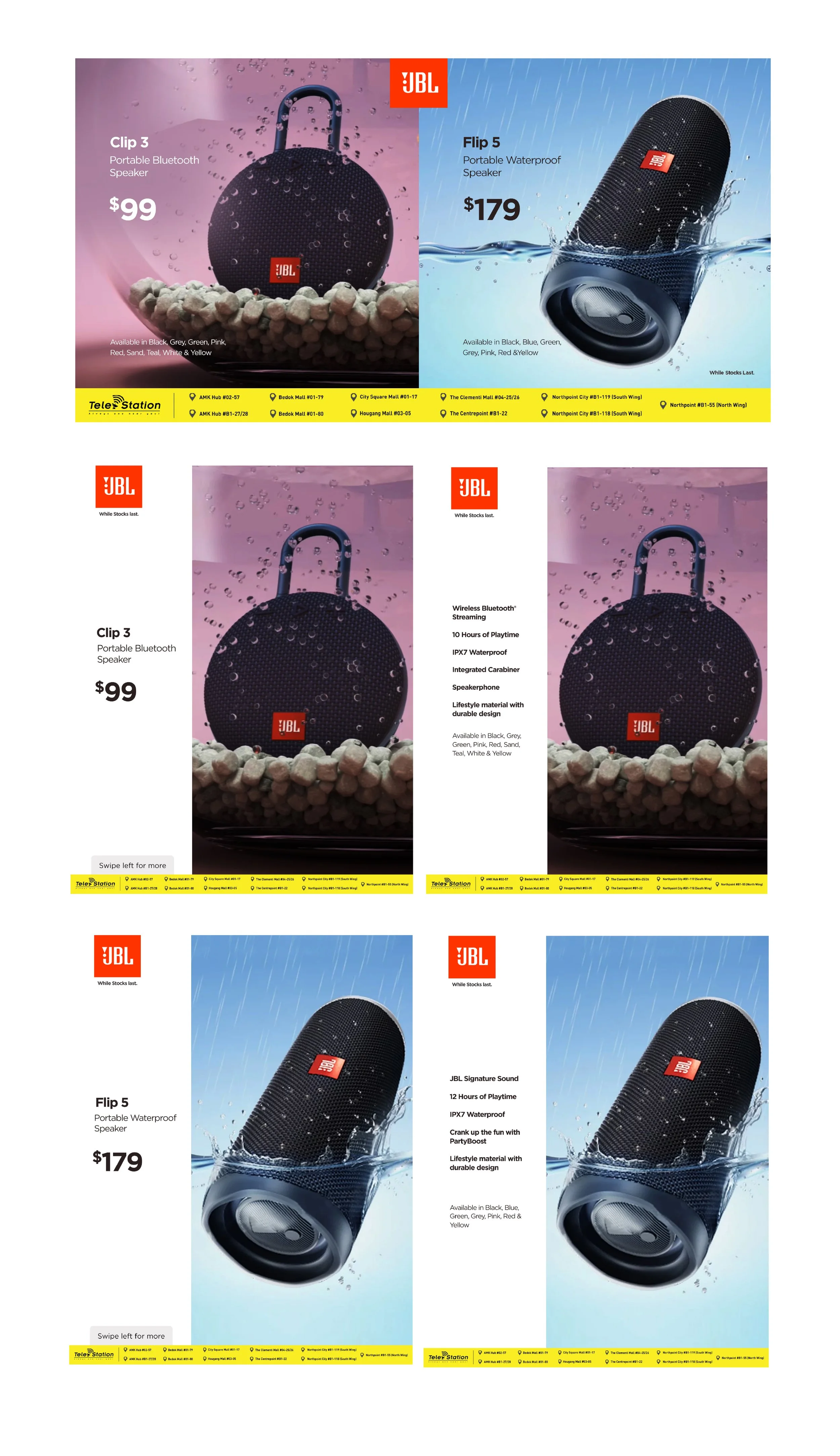 This series of promotional visuals focuses on JBL speakers and earbuds, created for social media campaigns across various digital platforms. The content was designed to capture attention quickly while effectively communicating product features, promotions, and key selling points to a broad audience.