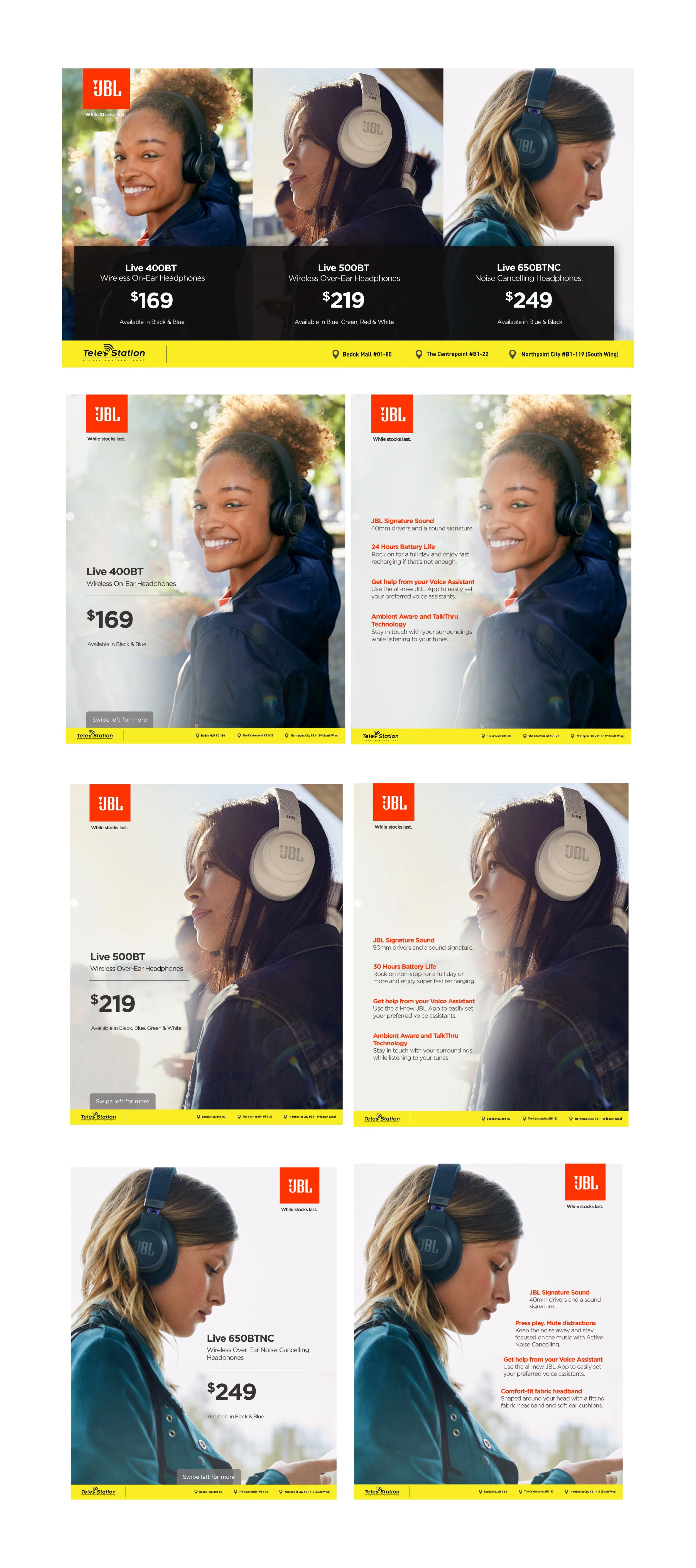 While adhering to JBL’s brand identity, I explored different visual approaches to keep the content fresh and engaging across multiple posts. This body of work reflects my ability to create effective, platform-optimized promotional visuals that showcase products clearly while maintaining a consistent and compelling visual language.